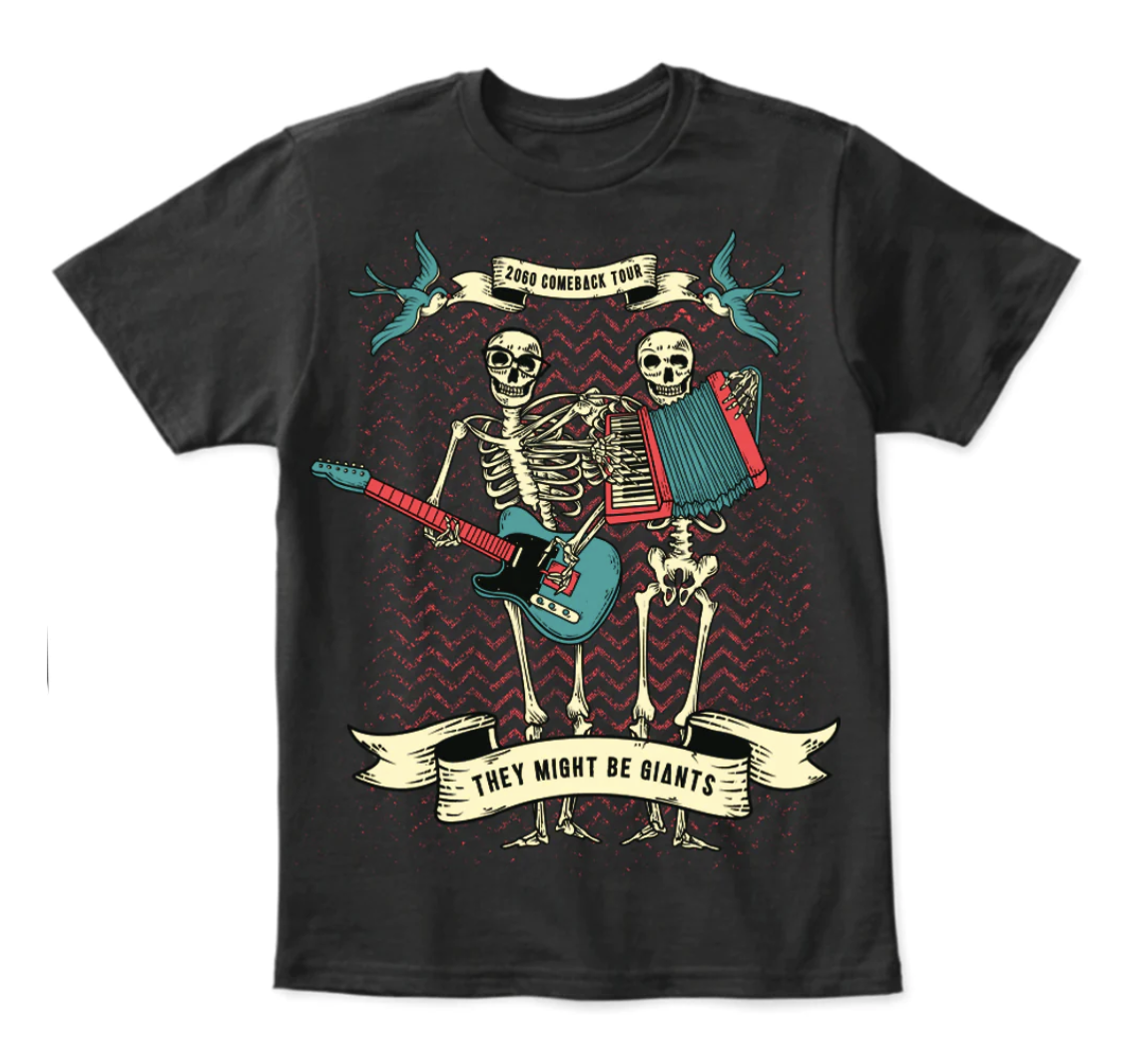But no show is a real rock show without real rock clothes, and that means BAND SHIRTS. In anticipation we have ordered VAST QUANTITIES of shirts and many new and old designs are IN STOCK in a WIDE ARRAY of sizes. In order to fascinate you and expand everyone’s floordrobe, we are momentarily letting folks on this mailing list in on a special discount code: OURMISTAKE24 for www.TMBGshop.com
