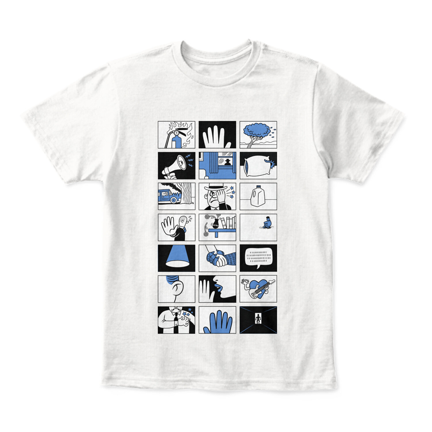 Yes, inspired by the song Fingertips, from the fevered imagination of David Cowles this is our first WORDLESS t-shirt. It illustrates every section of the song, and undoubtably will fit in proudly among the most revered designs in the hallowed halls of the They Might Be Giants T-Shirt Museum (currently being designed, to be built along side the Museum of Pop Culture in Seattle, WA).