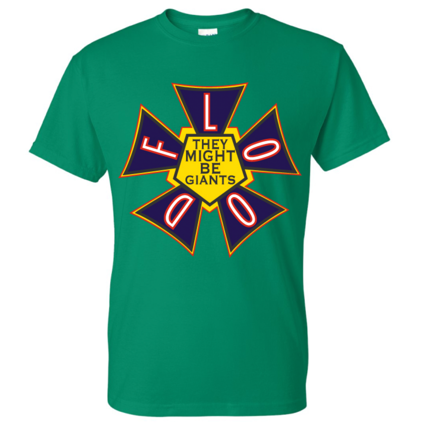 The Flood logo on a kelly green shirt