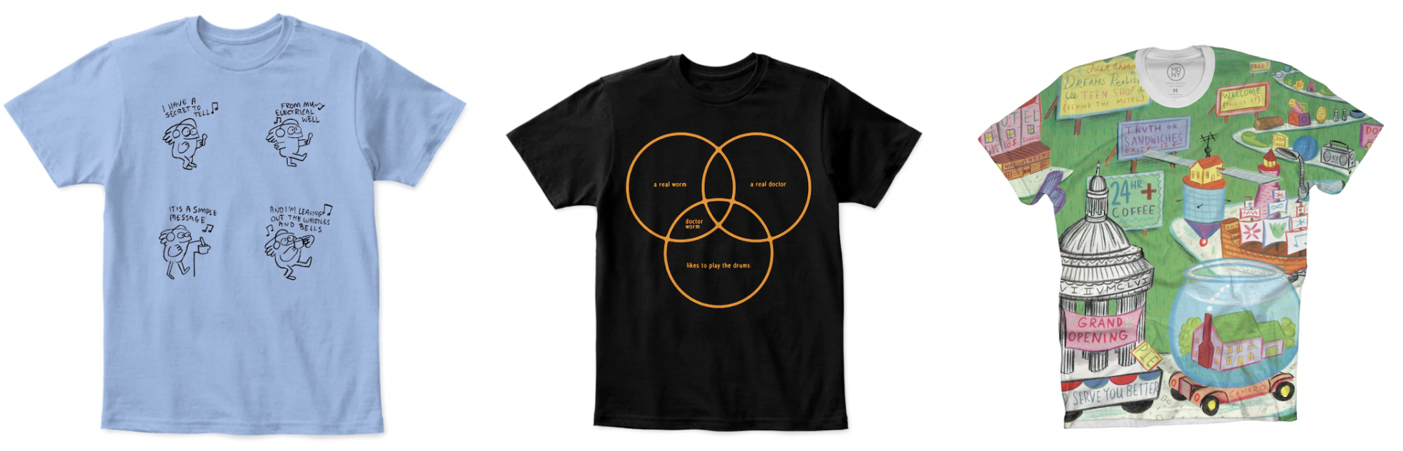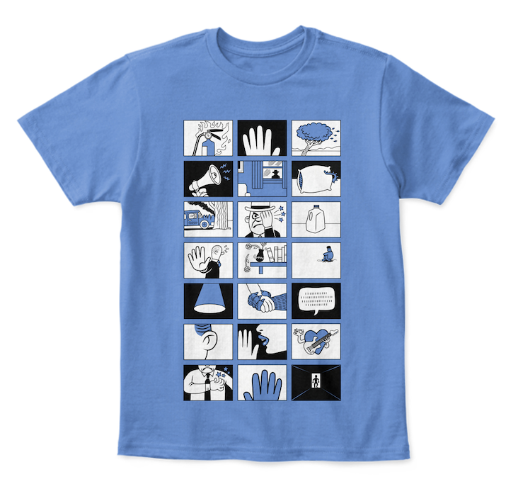 There are two notable shirts that are about to come into production that we can’t afford to put on sale yet—the white and blue WORDLESS FINGERTIPS SHIRT aka OUR GREATEST SHIRT EVER. If you wish to get that shirt and some sales shirts at the same time, we can bundle them together and ship in a couple of weeks. That shirt could easily be worth waiting for, and looks like this…