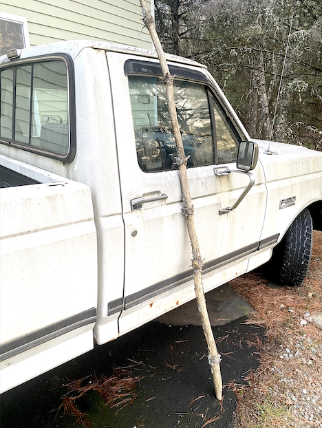 John F. here. TMBG is planning on bringing back Lie Still, Little Bottle for these Midwest shows, and, while raking up pinecones today, I think I ran across the perfect specimen — light, sturdy, and burning with a fire from deep within. Rusting Ford F150 for scale.