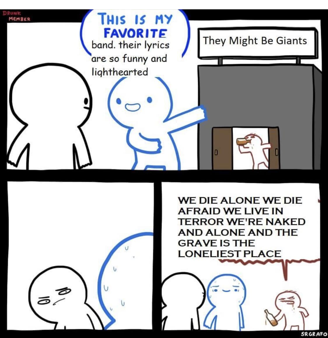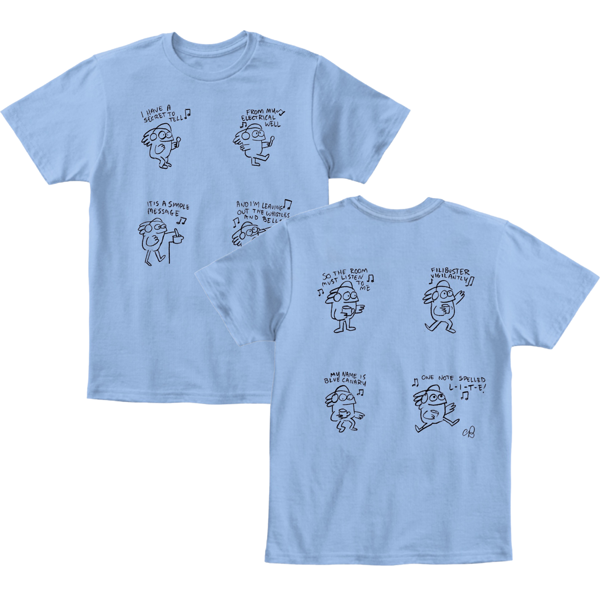 And finally, for all who have a secret to tell, here is the BUB COMIC shirt designed by Claire Brown. It includes lyrics to the song Birdhouse in Your Soul, and is perhaps the perfect shirt for you, for us, for everyone. Is yours already worn out because you wear it every day? The Bub Comic shirt is back in stock right here, right now, and ready for your perfect summer. Use the code ZOINKS at www.TMBGshop.com.