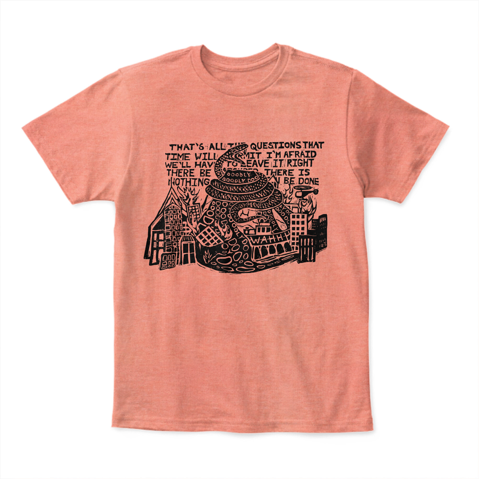 It’s true. We have a brand new shirt, illustrating a fragment of lyrics from SYNOPSIS FOR LATECOMERS. We welcome artist Kelilah Miller to the illustrious parade of fantastic Team T-Shirt Folk. The design is a linocut, and we suspect this will be a popular one. We are trying an experiment, putting two different color shirts on offer as pre-orders. They both look really cool in perfect summer colors CORAL and NEPTUNE BLUE.