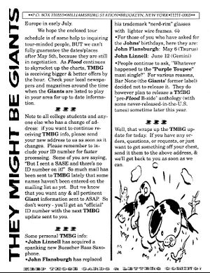 Welcome to the newest members of the They Might Be Giants Information Club, and of course hello again to all you "old timers" out there. In the past few months the P.O. Box at Williamsburg Station has been stuffed with cards & letters & packages from fans and well wishers. A veritable flood o' mail you might say. The TMBG Information Club is just that—an outlet for information. It is not a fan club even though we assume that those who write in are indeed fans. The 2 SASEs that you (most of you anyway) have sent in are used as follows: one for for the info club to send you back updates &/or goodies in (the larger envelope the better—for you) and the other goes along with the letter (if you included one) you write to the Johns. Yes, they do indeed read their fan mail, and if something strikes them as interesting they answer it. So all of you who send only the SASes and nothing else, don't expect a personal reply from the Giants. Only info!