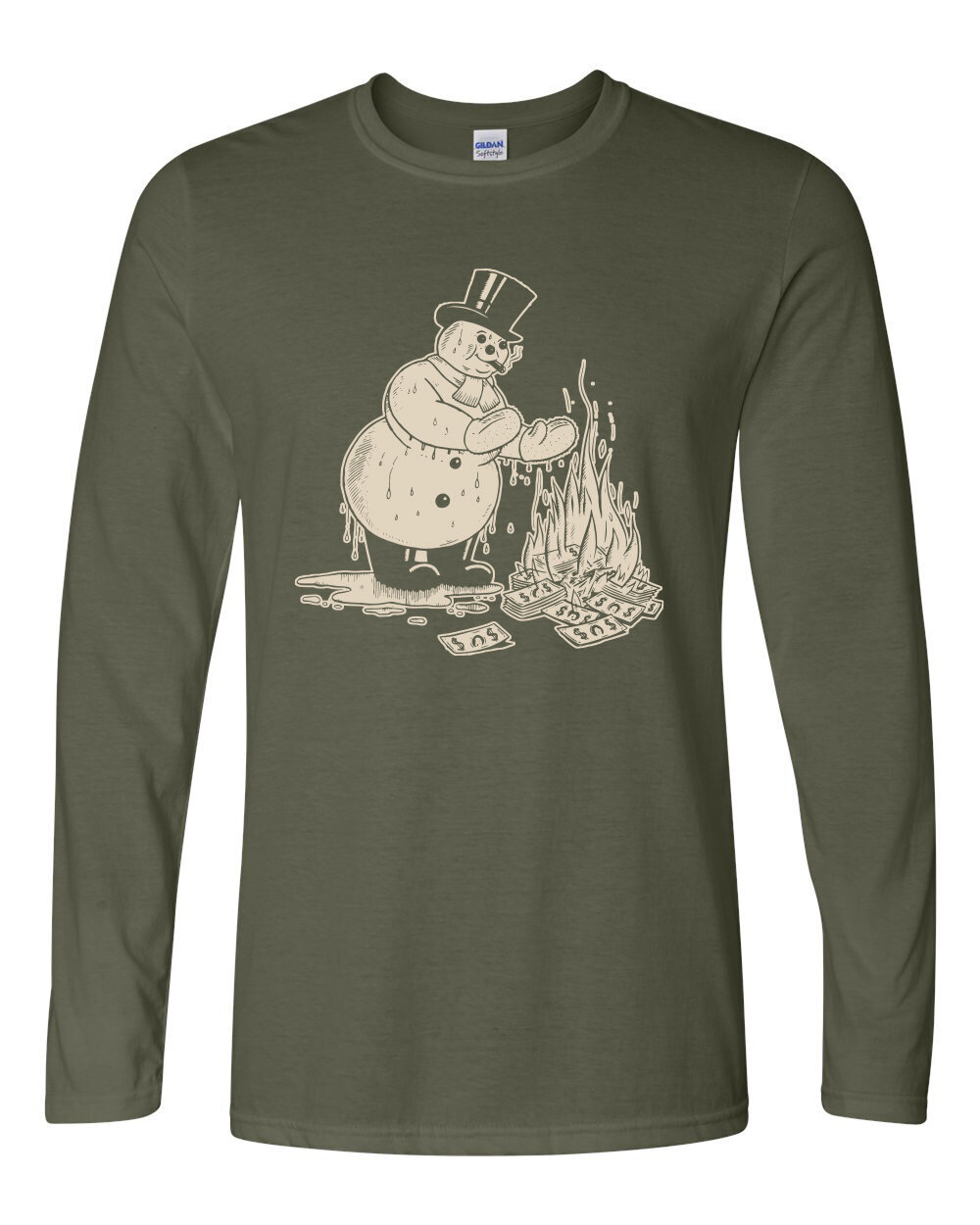 In stock and shipping now! The beloved snowman design is now available on this military green long-sleeve shirt.