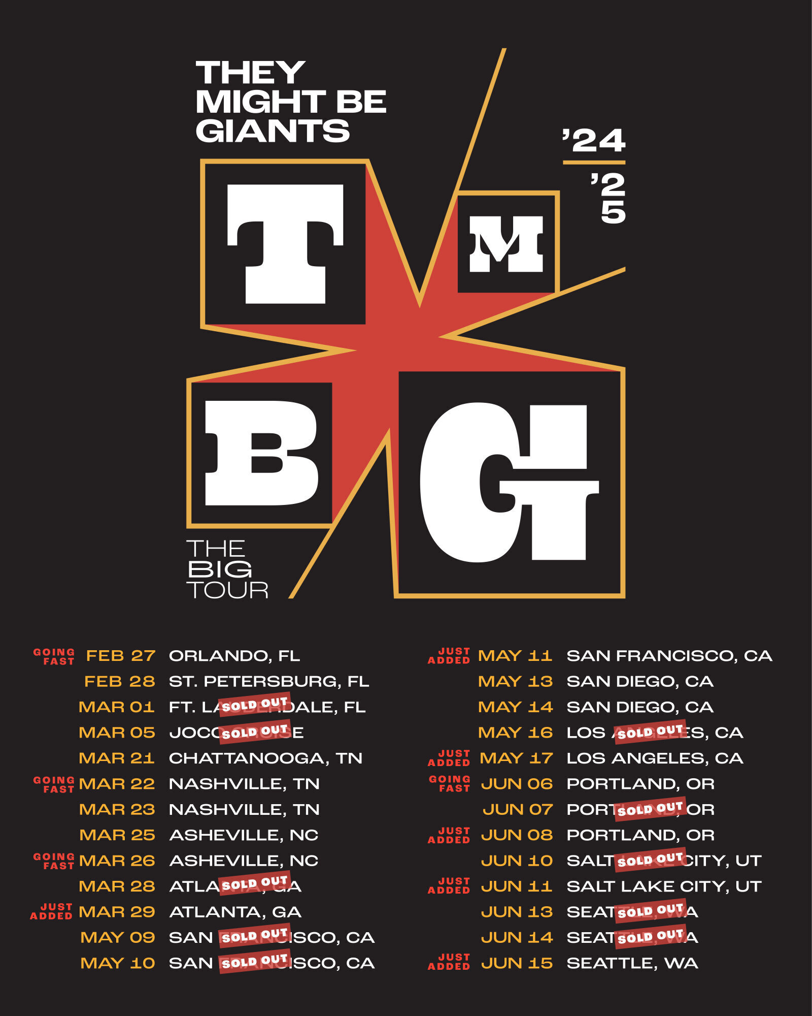 ๐ Give the gift of TMBG tickets! ๐ SF LA ATL SD SLC Orlando St Pete Chattanooga Nashville Asheville Portland Seattle ๐[edit]