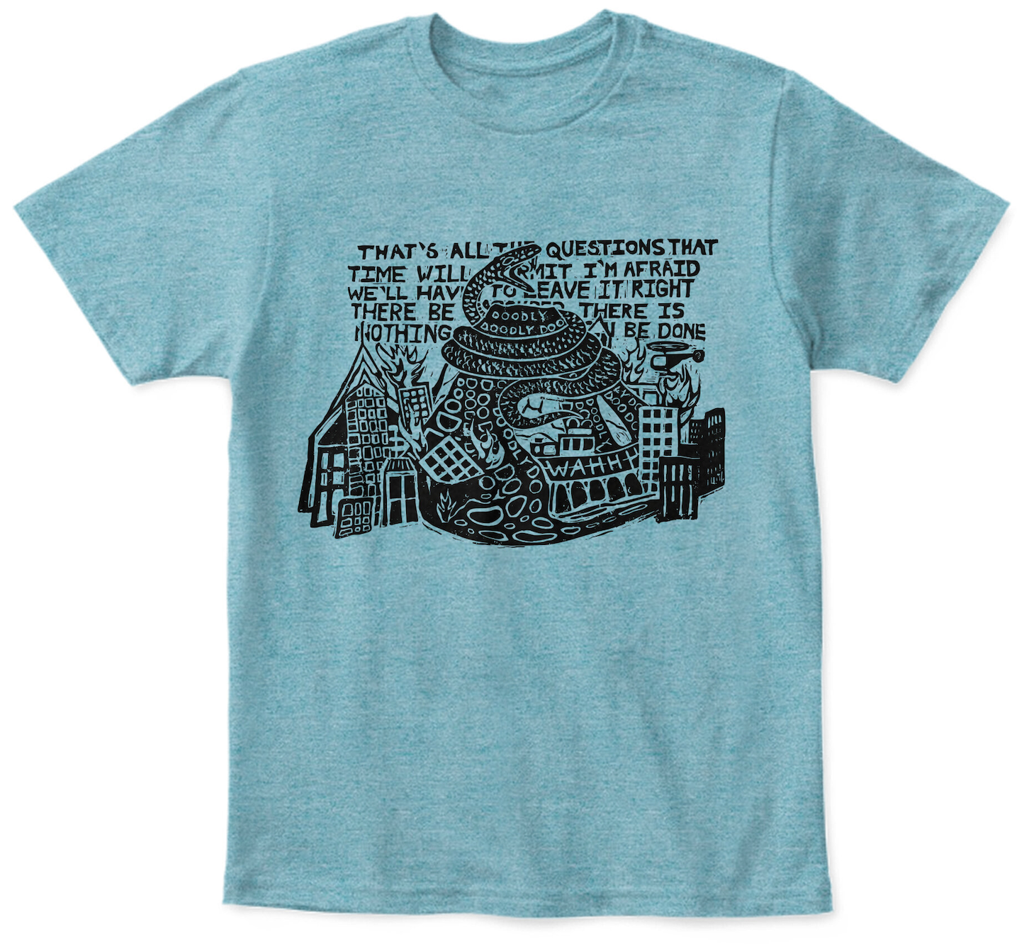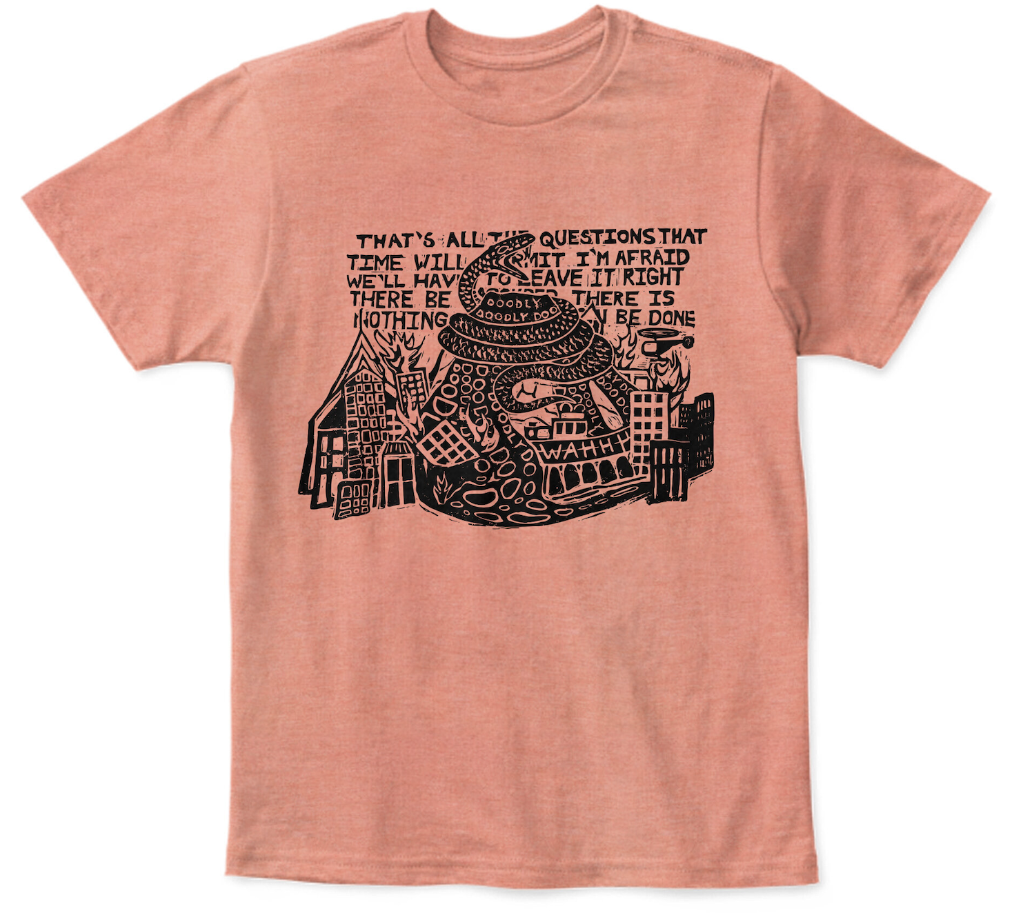 We have a brand new shirt, illustrating a fragment of lyrics from SYNOPSIS FOR LATECOMERS. We welcome artist Kelilah Miller to the illustrious parade of fantastic Team T-Shirt Folk. The design is a linocut, and we suspect this will be a popular one. We are trying an experiment, putting two different color shirts on offer as pre-orders. They both look really cool in perfect summer colors CORAL and NEPTUNE BLUE.