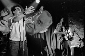 The Giants are a two man band from New Jersey, John Flansburgh and John Linnell. Between the two of them they played the guitar, accordion, baritone saxophone, and the big stick. For a Wednesday night show, the Giants packed in nearly 200 people at the club. The stage was pretty bare with three giant heads of Tom Carvel [sic] hanging from the ceiling, two tall black hats, and the big stick looming next to the amp. This gave a lot of room on stage for running around that the two did in fits of energy.