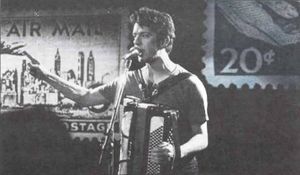 But no, at 11 o'clock John and John bounded on stage with instruments difficult to identify and launched in with "Your Racist Friend." Considering that all that was on the stage were six enlarged pictures of postage stamps, a metronome and two mike stands, They Might Be Giants managed to generate quite a stage presence.