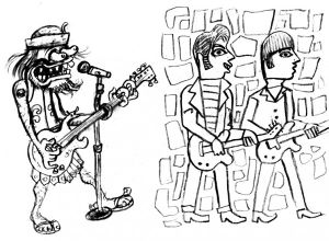 From John Linnell: "These are the first two drawings [David Cowles] sent us after he heard ["The Mesopotamians"]. The Ed "Big Daddy" Roth guy immediately won us over."[1]