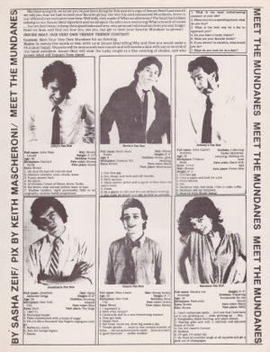 On November 7, 1980, the group opened for Talking Heads at Providence's Ocean State Theatre, performing for an audience of approximately 3,000 people; probably the largest show of the Mundanes' career.[16] That same month, they appeared on WQTV Boston's music program Boston...Live!. In March 1981, Dean Lozow was dismissed from group and the band was reduced to a quintet.[17] They stopped performing the songs he had written and John Andrews took over on bass. In April, they recorded another, longer demo tape at Normandy Sound, intended for submission to record labels in hopes of securing a contract.